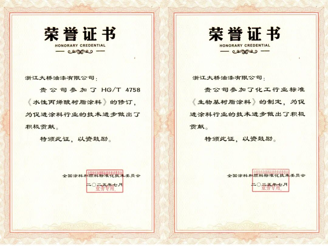 多年来,大桥油漆参与了18项国家标准和行业标准的起草制定和修订工作。今年,大桥油漆参与了化工行业标准《生物基树脂涂料》的制定与HG/T4758《水性丙烯酸树脂涂料》的修订工作。这两项标准直指绿色环保与生物基新材料的前沿领域。